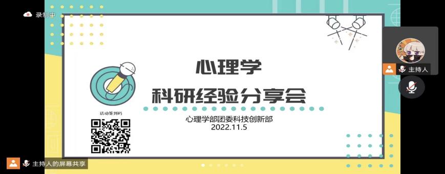 团委科技创新部主办的心理学科研经验分享会。 本次分享会邀请到了认知神经科学与学习国家重点实验室2022级研究生李博华师兄和中国基础教育质量监测协同创新中心2019级研究生赵云燕师姐,和同学们分享自己的科研经历。 本次分享会共分为嘉宾介绍、经验分享、交流问答三个环节。 首先,主持人安芯仪对两位嘉宾李博华师兄和赵云燕师姐以及本次分享会的主题进行了介绍。