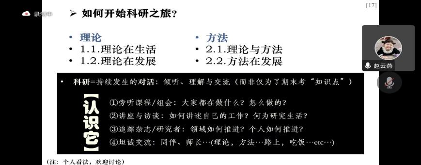 赵云燕师姐结合自身经历,以时间轴的形式向同学们展示了论文写作以及投稿的一般流程,并阐述了自己眼中的科研是什么以及如何开启并继续一段科研历程。师姐鼓励同学们通过旁听组会、追踪期刊、参加讲座等方式了解科研,建议同学们积极与老师交流。