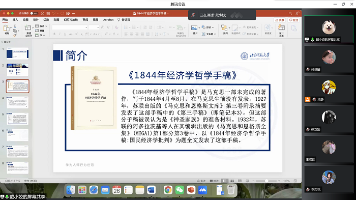首先,戴小姣师姐对《巴黎手稿》进行领读。师姐谈到了该书的写作背景、文章框架、主要内容和意义等多个方面,使大家对该书有了初步的认识。在内容上,师姐向我们启发性地介绍了“工人与资本家的辩证关系”“异化劳动的内涵”“异化劳动与私有财产之间的关系”等概念,表明《巴黎手稿》促进西方马克思主义的产生和发展的历史意义,让同志们更加全方位了解到了这本书的深远历史底蕴。