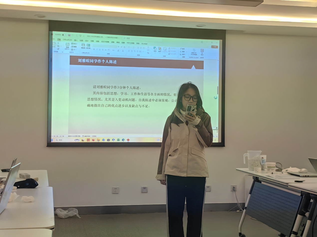 随后,推优人选刘雅暄上台发言。她分享了自己的成长经历和心路历程,深知自己的责任和使命,展现出了卓越的个人风采和积极向上的精神风貌,激发了在场团员们的奋进力量。同时,她也表示将继续保持谦逊谨慎、勤奋进取的精神,不断提升自己的综合素质和能力水平。