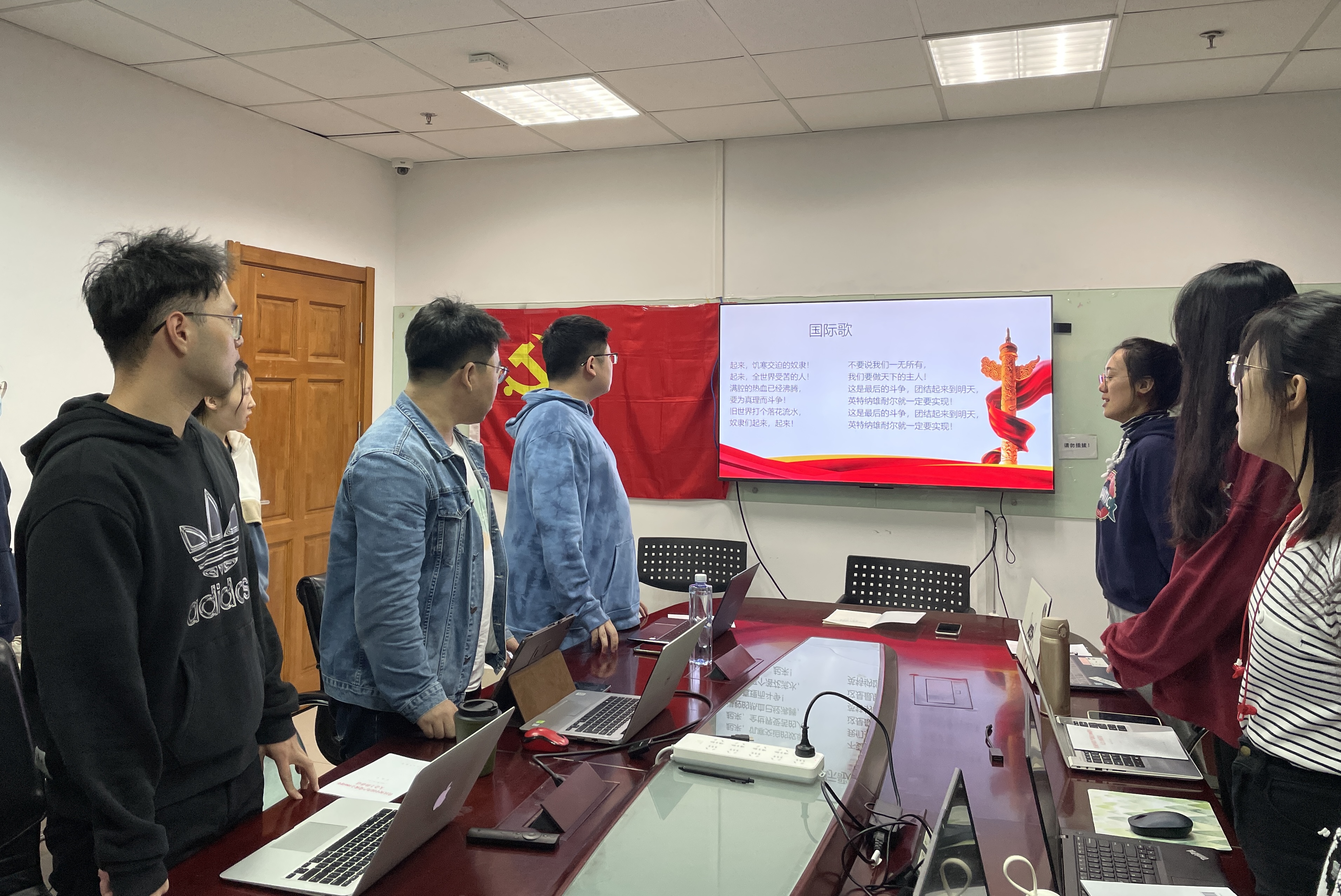 2021年10月10日晚六点,金牌影院 研究生第四党支部的支部成员们准时到达会议室,准备召开本学期第一次党支部会议。 正式会议开始前,全体党员起立,合唱《国际歌》。