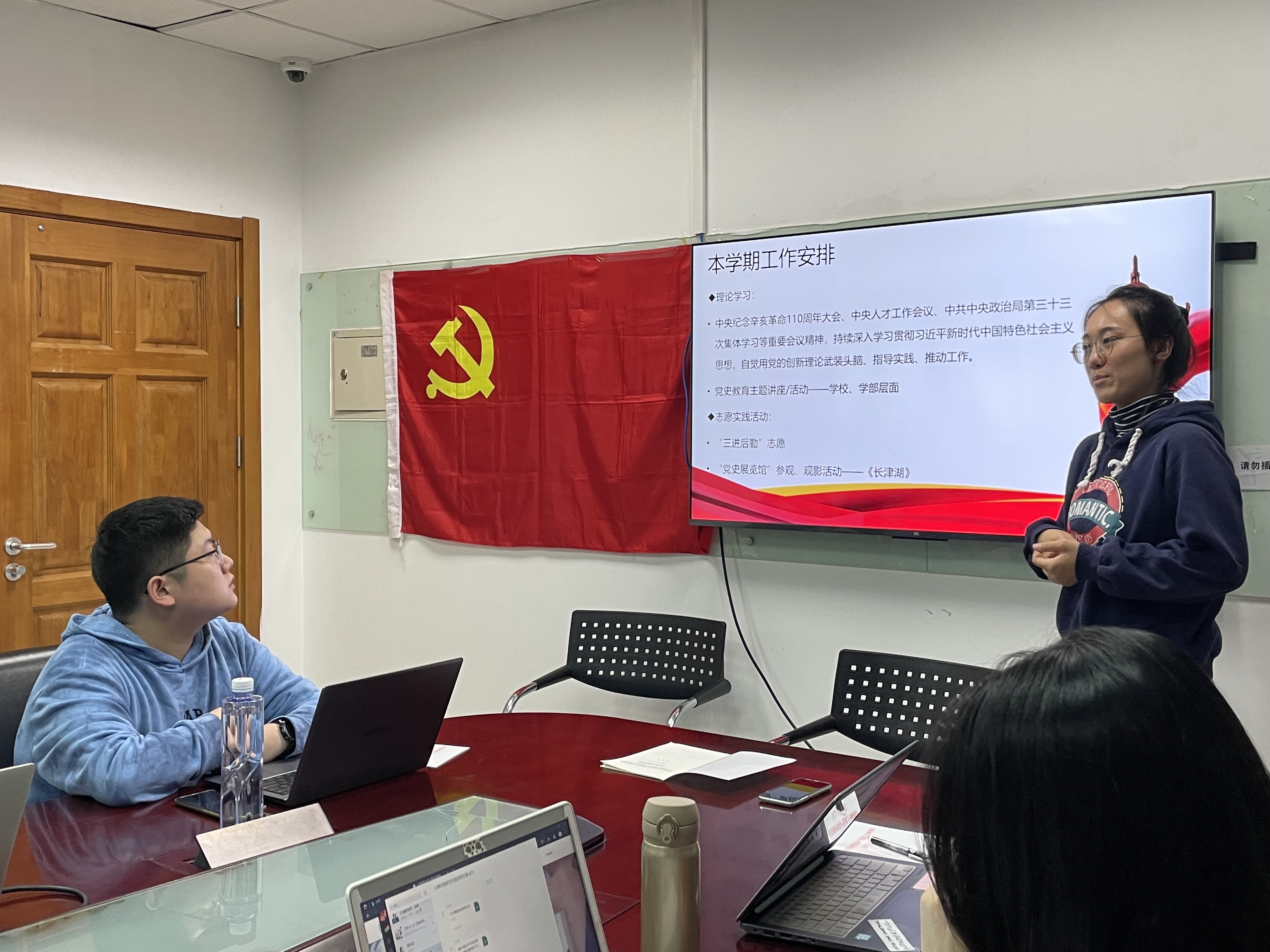 支部书记介绍本学期党支部工作安排 随后,会议开展了支部积极分子发展的预答辩环节。通过两名积极分子内容丰富、态度真挚的分享,在场的其他党支部成员见证了她们坚定的入党决心和令人惊喜的自我成长。汇报结束后,党支部成员对两名积极分子的表现提出了相应的改进建议。
