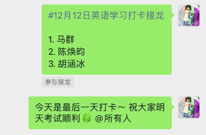 参与的同学需在指定的微信群内通过单词app打卡单词、短语、长句或150字以上的英语作文,以及分享优质学习笔记来完成学习打卡任务。最终评选出积分在前6名的同学获奖并发放精美奖品。