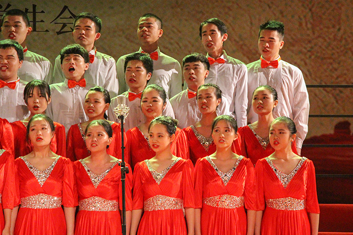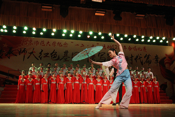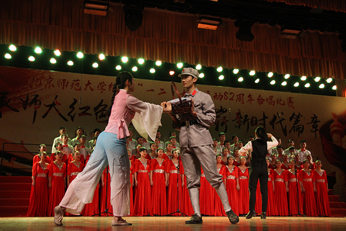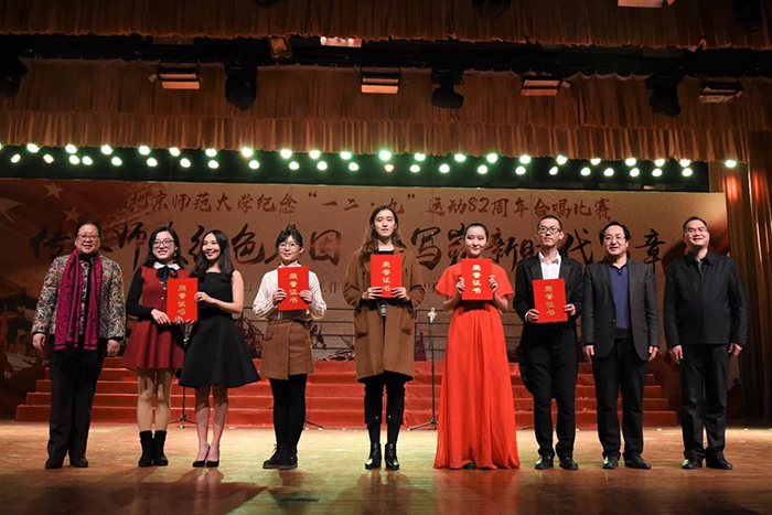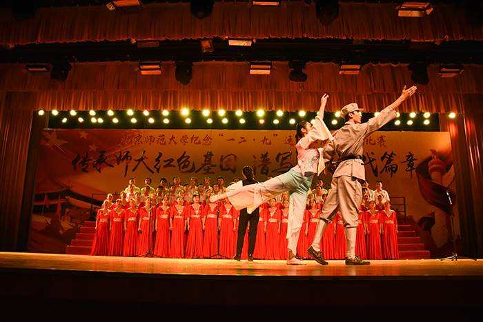 2017年12月9日晚19:00,2017年金牌影院 “传承师大红色基因,谱写时代崭新篇章”纪念“一二·九”运动82周年主题合唱比赛在学生活动中心隆重举行,金牌影院 合唱队作为第3支队伍登场,演唱经典曲目《十送红军》。