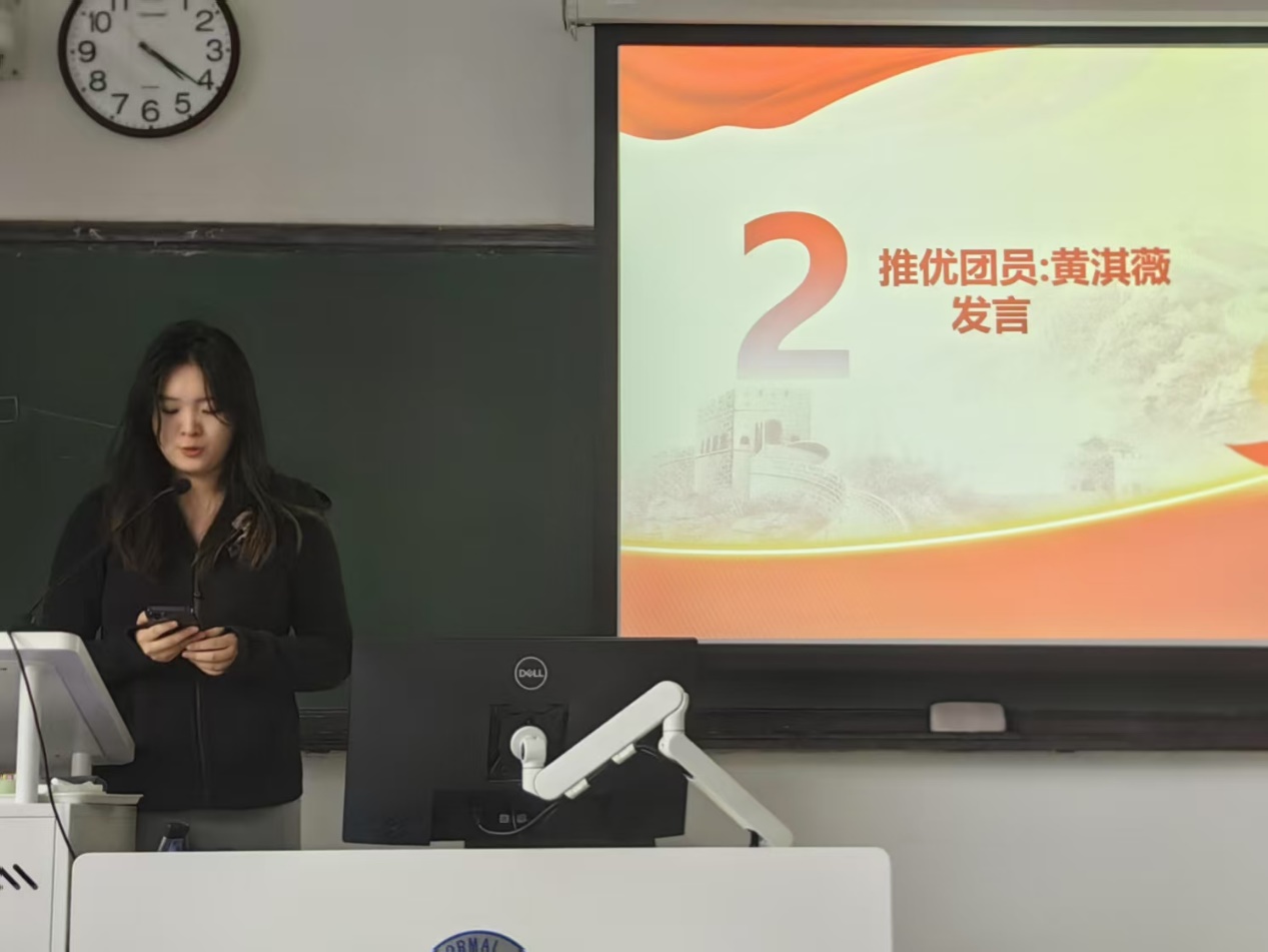 随后,推优人选黄淇薇上台发言。她分享了自己的成长经历和心路历程,深知自己的责任和使命,展现出了卓越的个人风采和积极向上的精神风貌,激发了在场团员们的奋进力量。同时,她也表示将继续保持谦逊谨慎、勤奋进取的精神,不断提升自己的综合素质和能力水平。 最后,经过23级其余团员的投票,推优人选黄淇薇获取推优资格,本次活动圆满结束。