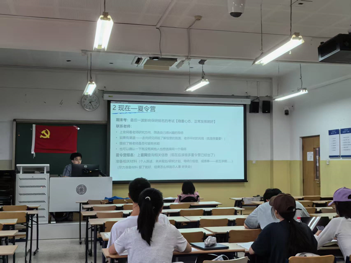 赵桢碧同志还强调了准备精品课程的重要性,这是展示自己教学能力和专业素养的关键环节。同时,赵桢碧同志也提醒同志们在求职过程中要保持积极的心态,不要因为一时的挫折而气馁,要相信自己的能力和价值,不断努力寻找适合自己的发展机会。 接下来,唐凤华同志通过视频的方式为同志们带来了本校保研的经验分享。她详细介绍了保研的时间线和考核内容,包括机考和面试。唐凤华师姐还提到了夏令营和期末考的重要性,建议同志们在期末考中保持稳重心态,正常发挥,同时积极关注夏令营的相关信息,提前联系导师。她提醒同志们在联系导师时,要提前了解导师的研究方向,确保自己与导师的科研兴趣和工作方式相匹配。