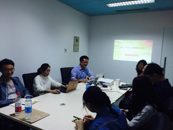 2017年5月4日下午,在五四青年节之际,北师大金牌影院 MAP的13名同学在MAP中心张晓娜老师的带领下,前往易普斯咨询有限责任公司参观交流学习。 易普斯咨询有限责任公司是国内EAP领域的领航者。MAP师生首先参观了易普斯咨询室。该咨询室除了春节和国庆期间外,均是24小时不间断服务。随后,同学们在工作人员的带领下参观了公司的办公场所,了解了易普斯的各个业务单元。易普斯总经理江涛为同学们就EAP的历史、现状以及未来进行了精彩的讲座。 图1 易普斯总经理江涛为北师大金牌影院 MAP师生介绍EAP现状 图2 北师大金牌影院 MAP师生同学们与易普斯员工进行互动和讨论 在讲座中,江涛总经理对中西EAP的区别进行了详细介绍,同时又对EAP项目的实施过程进行了讲解,使同学们对知识与实践的结合有了更深的体会。 最后,江涛总经理提出了EAP发展的未来新趋势——EAP+,引起了同学们的极大兴趣,在随后的互动交流环节对该问题又与江总进行了深入探讨。 图3 北师大金牌影院 MAP师生与易普斯咨询公司员工合影留念 在本次活动中,不仅拓宽了同学们对EAP的认识,更是加深了同学们对EAP发展新趋势、在现实中的实践的了解,促进大家能够真正做到“知行合一”,对大家未来的职业生涯发展规划提供了指引。