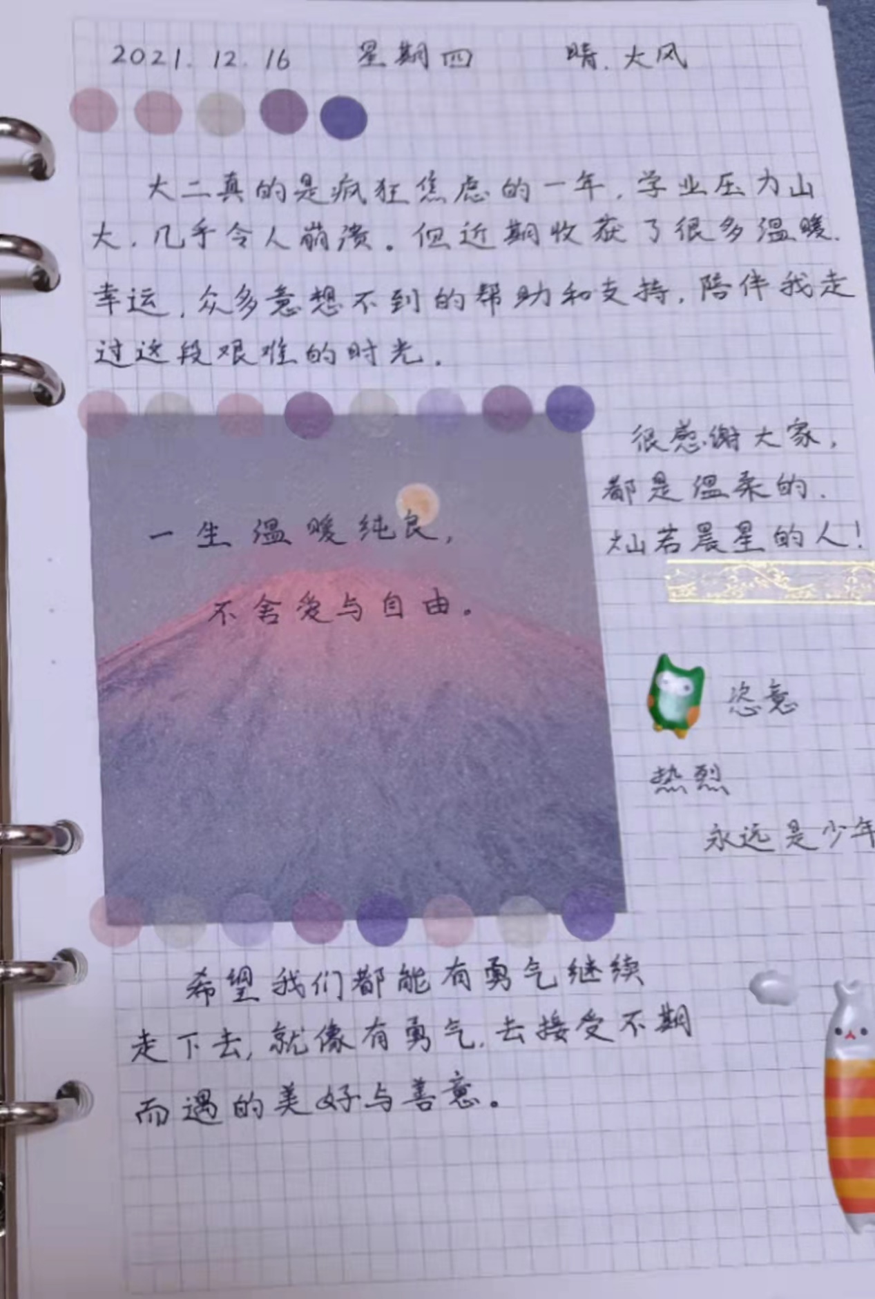 经过一个月左右的传递,我们看到有同学对一年来的生活进行了回顾,一年来同学们的全面成长令人感动、振奋;有同学对大二年级的压力进行了“吐槽”,但又在释放压力的同时表达了“要有勇气继续走下去”,“怀着当初那份热爱与热情继续向前走”,“把每天都过得很快乐,不被ddl压倒”。