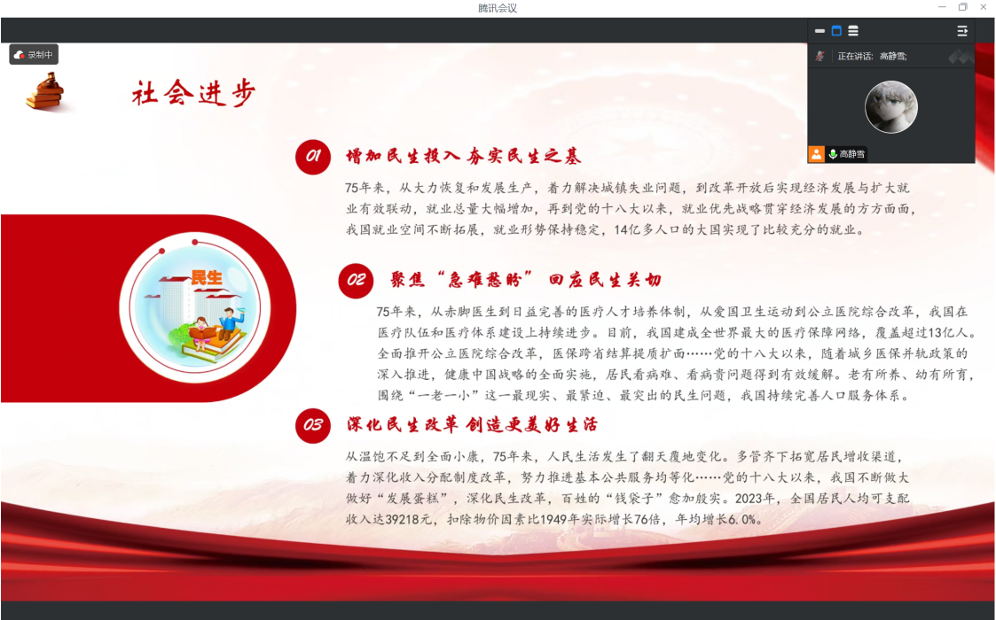 接下来,团支书从经济发展、科技进步、社会民生、国际地位四个角度展示了中国这75年来的辉煌成就。 在经济发展方面,新中国成立75年来,特别是党的十八大以来,中国经济规模连上台阶,经济总量从1952年的679亿元增长到2023年超过126万亿元,年均增长7.9%。这一增长不仅体现在数字上,更体现在人民生活水平的提高和国家实力的增强上。