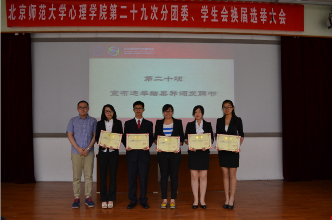 2014年6月7日,心理学院第二十九次分团委、学生会换届选举大会在教九502教室隆重召开。校团委副书记韩舰老师,心理学院分党委副书记王瑞敏老师,心理学院分团委书记曹昌健老师,地理学与遥感科学学院分团委书记倪佳琪老师,生命科学学院分团委书记刘芳南老师,信息科学与技术学院分团委书记奚琦老师,法学院分团委书记肖凡老师,校学生会副主席刘金同学,心理学院分团委李爽老师、史佳鑫老师、张丽霞老师以及各院系学生代表出席大会,全院200余名同学参加大会。大会由心理学院学生会副主席危胜男同学主持。 晚六时,大会开幕,全场起立,高唱《中华人民共和国国歌》。 首先,校团委副书记韩舰老师致辞。他在致辞中充分肯定了心理学院分团委、学生会一年以来的工作,并向大会的召开表示热烈的祝贺。随后,心理学院分党委副书记王瑞敏老师致辞。王老师在致辞中向大会的召开表示热烈的祝贺。她高度评价了心理学院分团委、学生会过去一学年中在引导学生思想、服务同学成长、繁荣同学日常生活、构建和谐校园等方面开展的大量卓有成效的工作,进而向团学干部提出要求,鼓励团学干部发挥自身创造力,发扬开拓精神,将学院经典活动品牌化、优势化。接下来,刘金同学代表校学生会致辞,表达了对新一届团学工作领导班子的期许。 心理学院学生会副主席毋梦薇同学代表筹委会向大会做了筹备情况报告。分团委副书记王波同学、学生会主席陈美玲同学分别向大会报告了2013-2014学年分团委和学生会的工作情况。 报告结束后,大会进入选举环节,分团委、学生会候选人依次进行竞选演讲并接受在场同学们的提问。随后,在总监票人周诗怡同学的主持下,在场全体同学进行了无记名投票。大会计票期间,刘庆芳同学向大会做了学生提案报告。之后,大会对心理学院13-14学年第二学期的优秀干事进行了表彰,分团委李爽老师、史佳鑫老师向心理学院新一届院刊主编、心理学社社长颁发了聘书。 计票结束后,总监票人周诗怡同学宣读了计票结果,分团委书记曹昌健老师宣布了选举结果,大会选举产生了金牌影院 心理学院第二十九届分团委副书记张文菊、学生会主席团成员张笑然、邓孟迪、李小红、闫梦格。随后,曹昌健老师向心理学院新一届分团委副书记、主席团成员颁发了聘书并进行了总结性发言。曹老师在发言中对心理学院全体同学、老一届学生干部以及支持学院学生活动的各位老师表达了感谢,同时对新一届的学生干部给予了厚望。最后,在曹老师的带领下,心理学院老一届学生干部向在场所有同学集体鞠躬表示感谢,现场响起了热烈的掌声。 在掌声中,本次换届选举大会圆满结束。新一轮的学生工作即将开始,我们相信,在新一届学生干部的努力下,心理学院的团学工作将会越来越好!