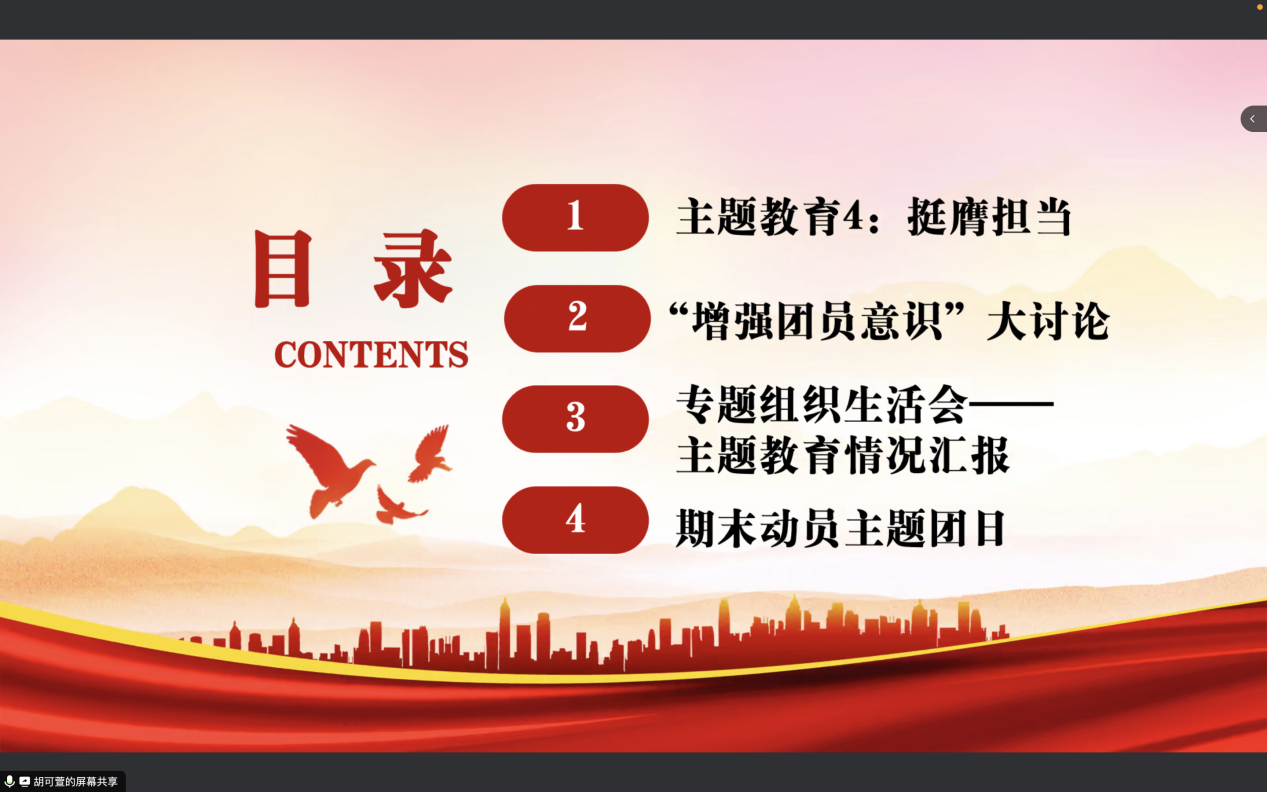 周星辰老师首先为同学们做期末考前动员,与同学们分享体验和经验。 期末动员结束后,团支部书记带领大家进行“挺膺担当”主题学习,布置“增强团员意识”大讨论安排并开展“主题教育情况汇报”专题组织生活会。 首先,我们奏唱团歌。在挺膺担当主题学习中,我们重点学习了习近平总书记对青年一代的殷切希望和重要要求,激发强国有我的青春激情,争做有理想、敢担当、能吃苦、肯奋斗的新时代好青年,在中国式现代化建设中挺膺担当。 之后,在大讨论环节中,同学们围绕“何为一名合格的共青团员”与“推动学习高质量发展中团员何为”两个核心问题,以习总书记对青年的期盼与指示为参考,思考了团员的责任与担当、可为与有为。