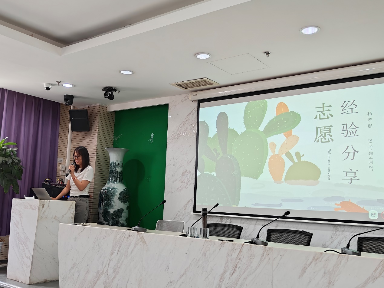 接下来杨若彤同学进行了志愿经验分享。她进行了书信类、会议志愿者、活动类和专业类等多种志愿活动,她分享到在进行不同种类志愿活动的过程中,她学会了如何回应提问,了解了举办一场会议和活动的流程,获得了扎实的专业能力和随机应变、沟通协调的能力。她表示志愿活动于内可以为他人做贡献,有利于自我提升,于外可以获得实践学时和综测加分,并给予了同学们一些选择志愿项目、参与志愿互动的建议,鼓励同学们多多参与。