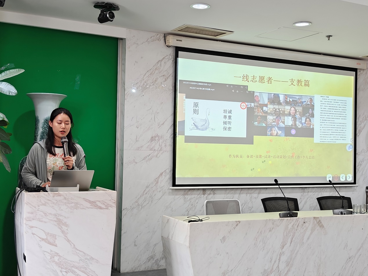 在合唱团歌后,李佳璐同学先进行了志愿经验分享。她和大家分享了自己进行的书信、支教等志愿活动。她讲到,志愿服务提升了她的策划、沟通和应对突发状况的能力,使她结识了许多朋友,体验了团体的温暖和归属感。最后她分享了学校内的志愿社团组织,如红十字会、白鸽青协等,为想进行志愿活动的同学提供了获得资讯的途径。