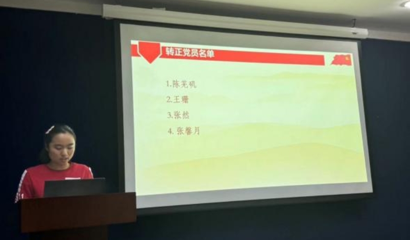 接着,张馨月同志上台宣读自己的《转正申请书》,介绍了自己在上一年度在思想,工作,生活等方面的成长,分享了自己多次支教的感悟。随后党员张心茹同志对张馨月同志的情况做出客观的评价,并提问了三个关于张馨月同志支教问题,张馨月同志详细说明了情况,随后表示自己在接下来的阶段会更加积极地投入到类似的活动中来。投票阶段,全体正式党员对张馨月同志的转正申请进行无记名投票,计票人张鼎晨同志宣读计票结果:16票通过,0票弃权,0票反对,同意张馨月同志成为中共正式党员。