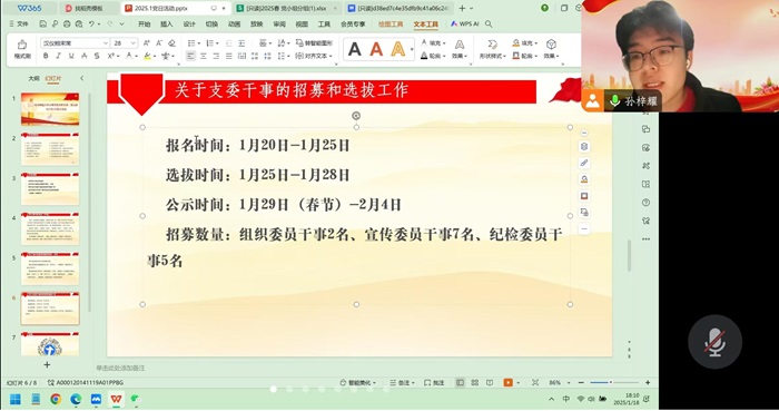 2025年1月18日18时,金牌影院 本科生第二党支部顺利召开了一月党日活动。会议通过“腾讯会议”平台以线上会议的形式进行,由党支部书记孙梓耀同志主持,共44名支部成员参与。本次会议的主要内容为《榜样》专题学习。