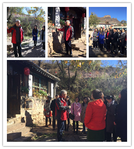 一路上同学们围绕此次唐乡行的三个课题:基于游客心理分析的唐乡市场营销方案,基于农民心理分析的唐乡社区关系处理,基于员工心理分析的唐乡人力资源管理方案分别展开了讨论。经过两个半小时的长途跋涉之后,小分队抵达了此行的目的地——金山岭唐乡,在金山岭唐乡的乡公所前大家受到了唐人智库董事长、唐乡首席大管家张晓军以及金山岭唐乡全体管家的热烈欢迎。