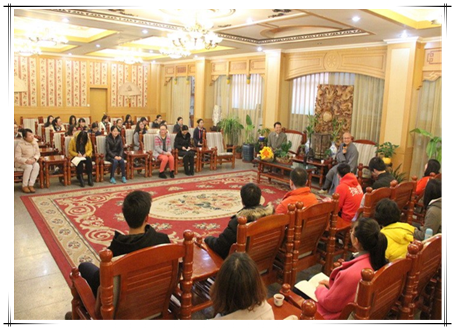 张日昇教授自2005年开始带学生到柏林禅寺禅修。11月25日一到寺庙,张日昇教授就受到柏林禅寺的方丈明海大和尚的欢迎,在到寺的当晚还亲自到禅堂为我们师生讲授了“佛教”和“禅”的基础知识以及其与心理学的关系,并亲自教授我们打坐技巧和修行心得。明宣法师、明玄法师、崇密法师、道法法师等法师在这三天的禅修中也为我们讲授了很多禅和佛的知识,以及在生活中的运用,告诉我们:“觉悟人生,奉献人生,照顾好每一个当下,就是最好的修行!”
