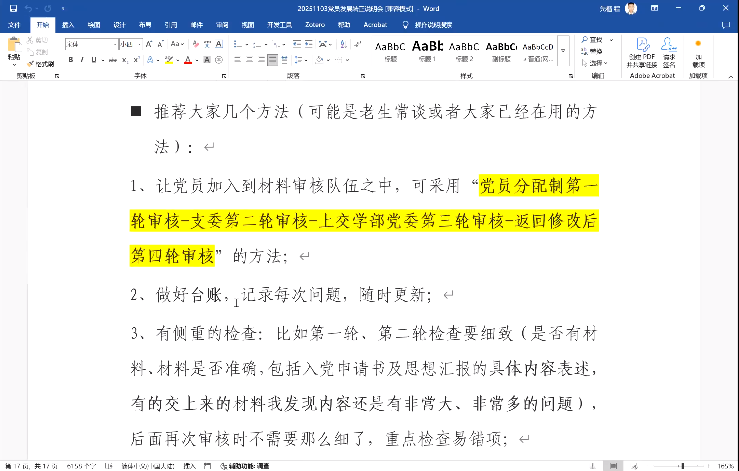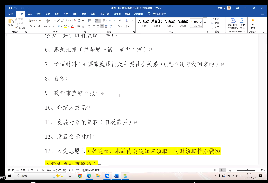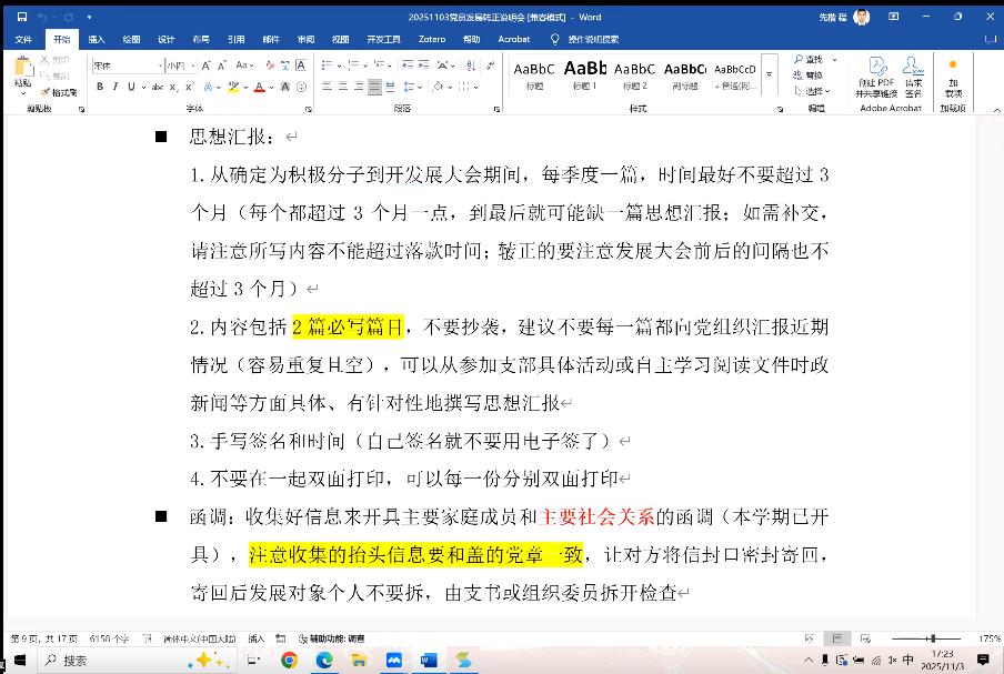 首先,齐乐融融老师介绍了发展转正所需材料的撰写要求,并重点介绍了其中易错和易出现不准确的细节,要求各支部组织同学规范准备相关材料,并认真审核。