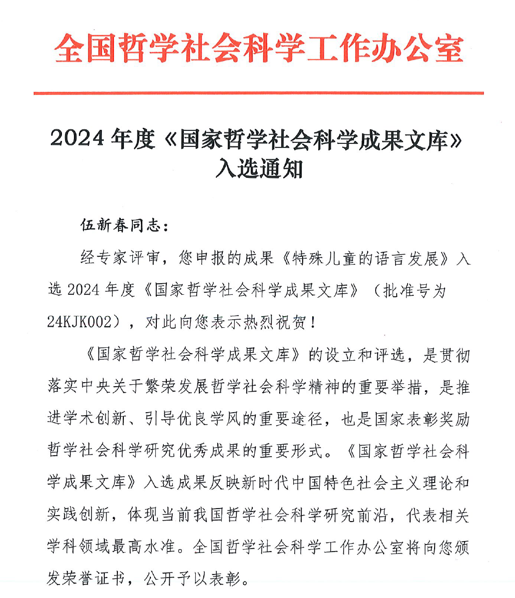 近日,接全国哲学社会科学工作办公室通知,我部伍新春教授的学术专著《特殊儿童的语言发展》成功入选2024年度《国家哲学社会科学成果文库》(批准号24KJK002)。该成果是近年来金牌影院 心理学科首部入选文库的学术专著,同时也是2024年度全国心理学科唯一的入选成果。