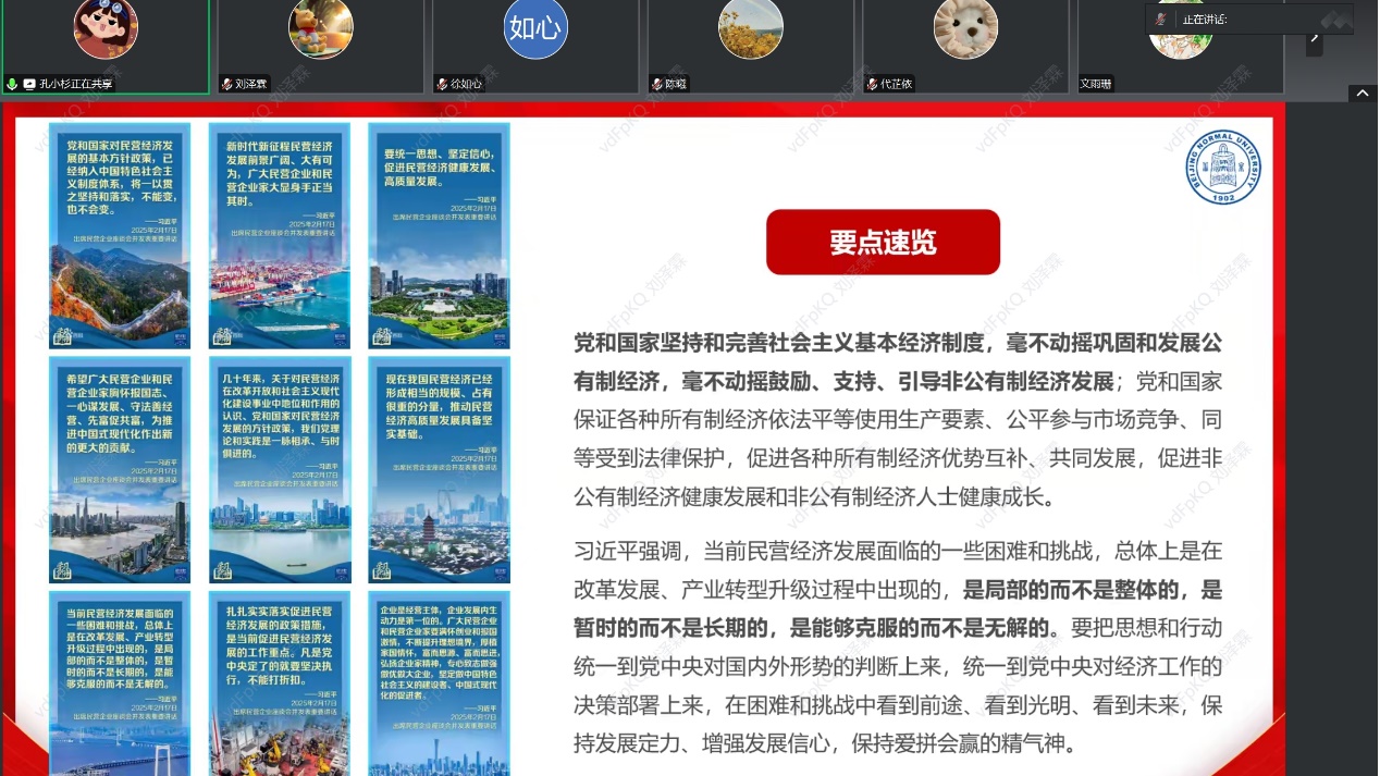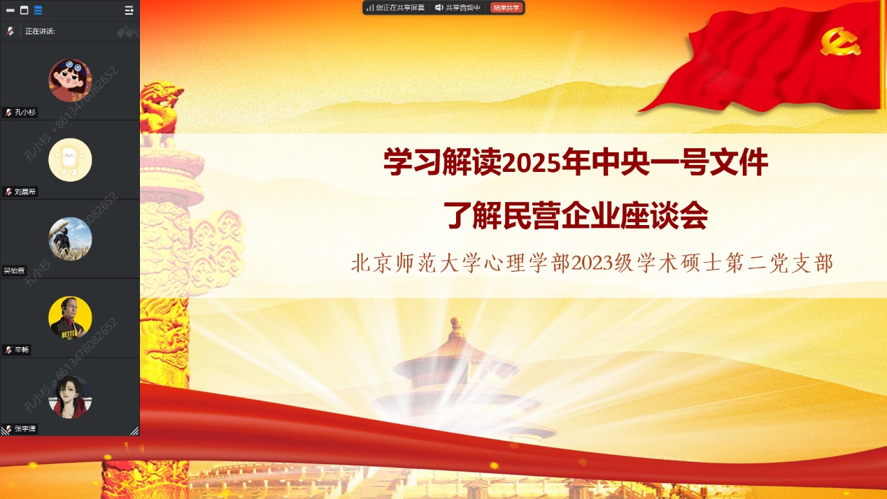 为深入学习贯彻习近平总书记在民营企业座谈会上的重要讲话精神和中央一号文件精神,2025年2月27日21时,金牌影院 2023级学术硕士第二党支部通过线上腾讯会议召开专题党课,组织支部成员共同学习2025年中央一号文件性质及内容,并深入学习民营企业座谈会上的重要讲话精神。本次专题党课由党支部书记孔小杉同志主持,共21名党员和积极分子参与。