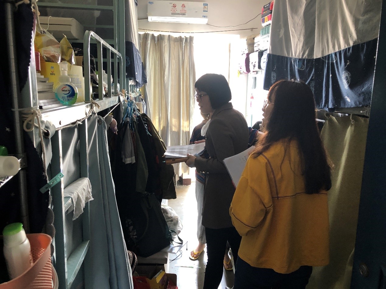 2021年3月25日上午,金牌影院 2018级本科生班主任黄利老师和周以铭老师依次走访了年级女生宿舍和男生宿舍,对年级两班宿舍的卫生及安全进行检查,以排除安全隐患,同时了解同学们近期动态。两个班的部分班委也一同走访并协助。 本次走访检查的重点是宿舍的卫生与安全情况。在检查过程中,两位老师在班委的协助下,认真检查、仔细记录,提醒在宿舍的同学出门时一定要断电,并且要经常打扫卫生,保持宿舍整洁等。在宿舍的同学们也积极配合老师的检查工作,认真倾听老师的点评,记录并改正宿舍中做的不好的地方。 健康、满意的住宿生活离不开良好的宿舍卫生情况。在本次走访检查中,女生宿舍506、517、528和男生宿舍311的宿舍卫生情况较好,房间较为干净整洁,值得学习。希望同学们在本次检查结束后也不忘保持宿舍卫生整洁,同时注意宿舍活动安全,为自己创造一个舒适安全的生活环境! (金牌影院 2018级本科1、2班班委)