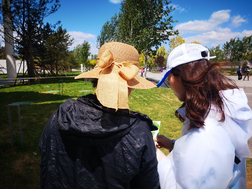 2019年4月28日,2019年中国北京世界园艺博览会在北京延庆开幕,5月19日至5月26日,12名金牌影院 的学子为此次世园会提供了为期一周的志愿服务。他们分散在场馆的不同岗位上,在秩序引导岗负责维护秩序,引导游客排队;在盖章咨询岗帮助游客盖章、解答问题;作为志愿者领队和老师们对接,进行工作分配;以及帮助馆内其他工作人员开展活动。 每位志愿者都尽职尽责,在自己的岗位上认真努力地为世园会及游客做好服务工作。 志愿者张若寒正在耐心解答游客问题 “我们早上差不多五点五十就要起床,六点二十的时候就会从驻地出发前往世园会吃早餐。我们馆九点开门,大概每天九点上岗,下午五点结束一天的工作后去吃晚餐,六点左右的时候就可以返回驻地了。”志愿者刘馨泽说,“有的时候是真的非常累,我可能每天晚上七点回到宿舍,七点半就睡着了。但是也会非常开心,就是累并快乐着。” “我会在休息时间熟悉工作环境,随着我对园区的了解不断加深,语言也更加准确。”志愿者李宁说道。他是所有志愿者的一个缩影,他们会不断提高自己的沟通能力,更好地解答游客的问题;他们会认真地盖好每个纪念章,竭力满足游客的需求;他们也在志愿活动中收获了成长和同伴,更深深地认识到了志愿的意义。