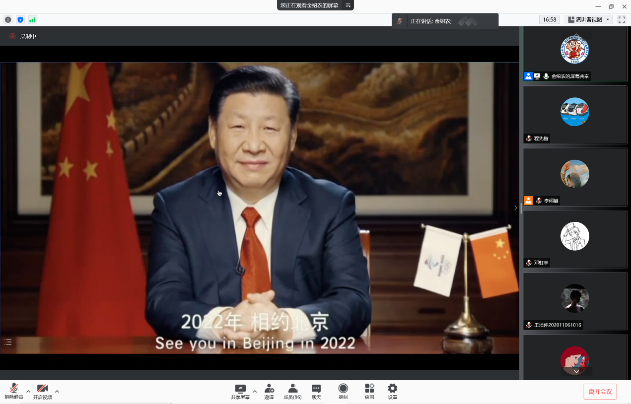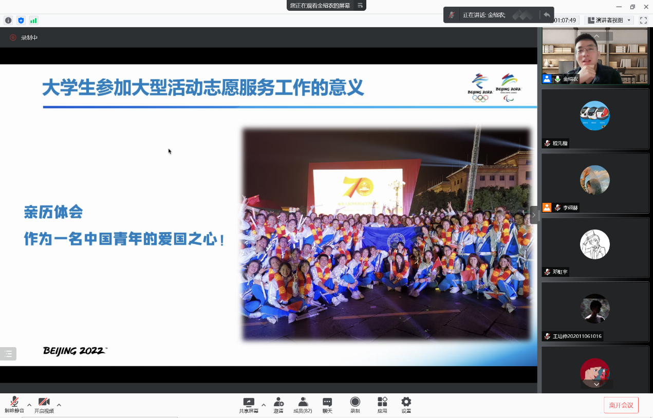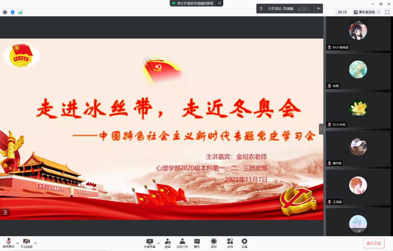 2021年11月7日15:30,金牌影院 金牌影院 2020级本科第一、二、三团支部中国特色社会主义新时代专题党史学习会分享党史学习会在腾讯会议线上顺利召开,会议邀请到了国家速滑馆赛事服务副经理、校团委宣传部长、三班班主任金绍农老师为大家分享冬奥志愿服务的有关工作经历。会议由第三团支部书记李翊赫同学主持。