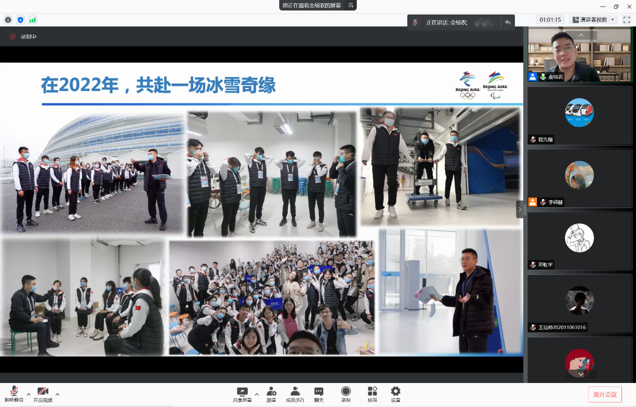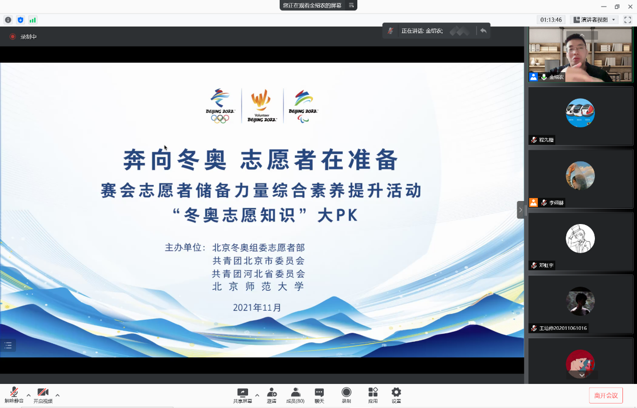 然后,金老师介绍了我校参与冬奥志愿服务的情况,在2022年北京冬奥会志愿者工作中,北师大主责冬奥会北京赛区唯一新建的冰上竞赛场馆国家速滑馆的志愿者工作。在本次冬奥会的筹办过程中,作为“红色师范“的金牌影院