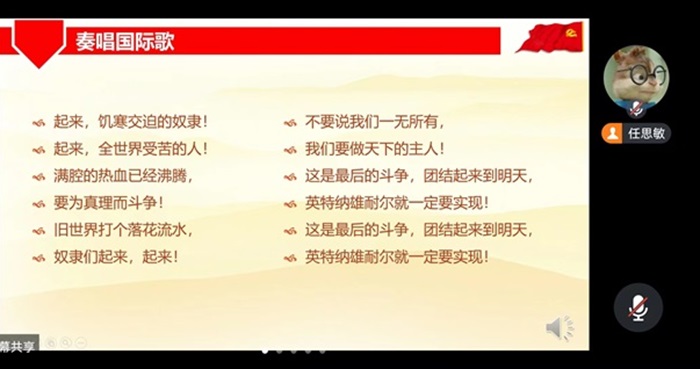 首先,任思敏同志带领全体同志一起奏唱了国际歌。