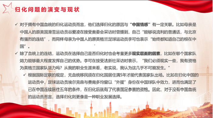 本科生第二党支部第四党小组通过“腾讯会议”在线上顺利召开了党小组时事分享会。本次会议由第二党支部第四小组组长程先楷主持,共12名党员、预备党员及积极分子同志参与。会议先后进行了奏唱国际歌、时事分享、问题讨论三项内容。 在会议开始前,全体参会同志填写签到问卷。 首先是奏唱国际歌,全体参会同志起立唱国际歌。 接着是时事分享,第一位分享的同志是马新超,主题是如何看待运动员归化问题。马新超同志从参加2022年北京冬奥会的运动员谷爱凌谈起,引入运动员归化问题的演变与现状,提出两个讨论问题,即如何看待归化问题,归化运动员的利与弊是什么。最后还对归化运动员的未来实施展开了思考。