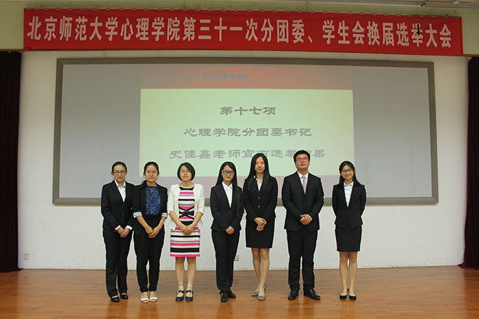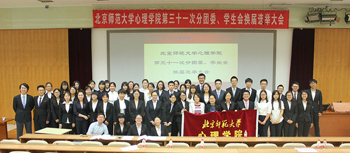 2016年6月5日, 心理学院第三十一次分团委、学生会换届选举大会在教九502隆重召开。校团委副书记孙薇薇老师,政府管理学院分团委书记谢羚老师,数学科学学院分团委书记郭晓川老师,物理学系分团委书记刘珊珊老师,校学生会副主席裔志辉同学以及各院系学生代表受邀出席,我院分党委副书记王瑞敏老师,分团委书记史佳鑫老师以及全院300余名同学参加了此次大会。心理学院学生会主席助理张兆祺主持。