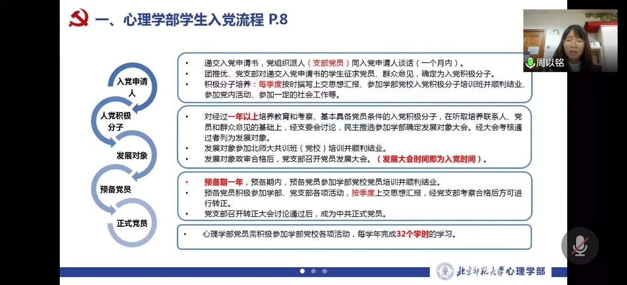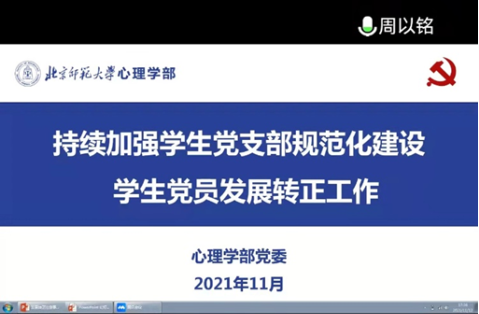 金牌影院 2021-2022学年秋季学期发展转正工作说明会于2021年11月12日下午召开。受疫情影响,本次会议线上召开。周以铭老师及本学期需召开发展转正大会的支部书记与组委参与会议。