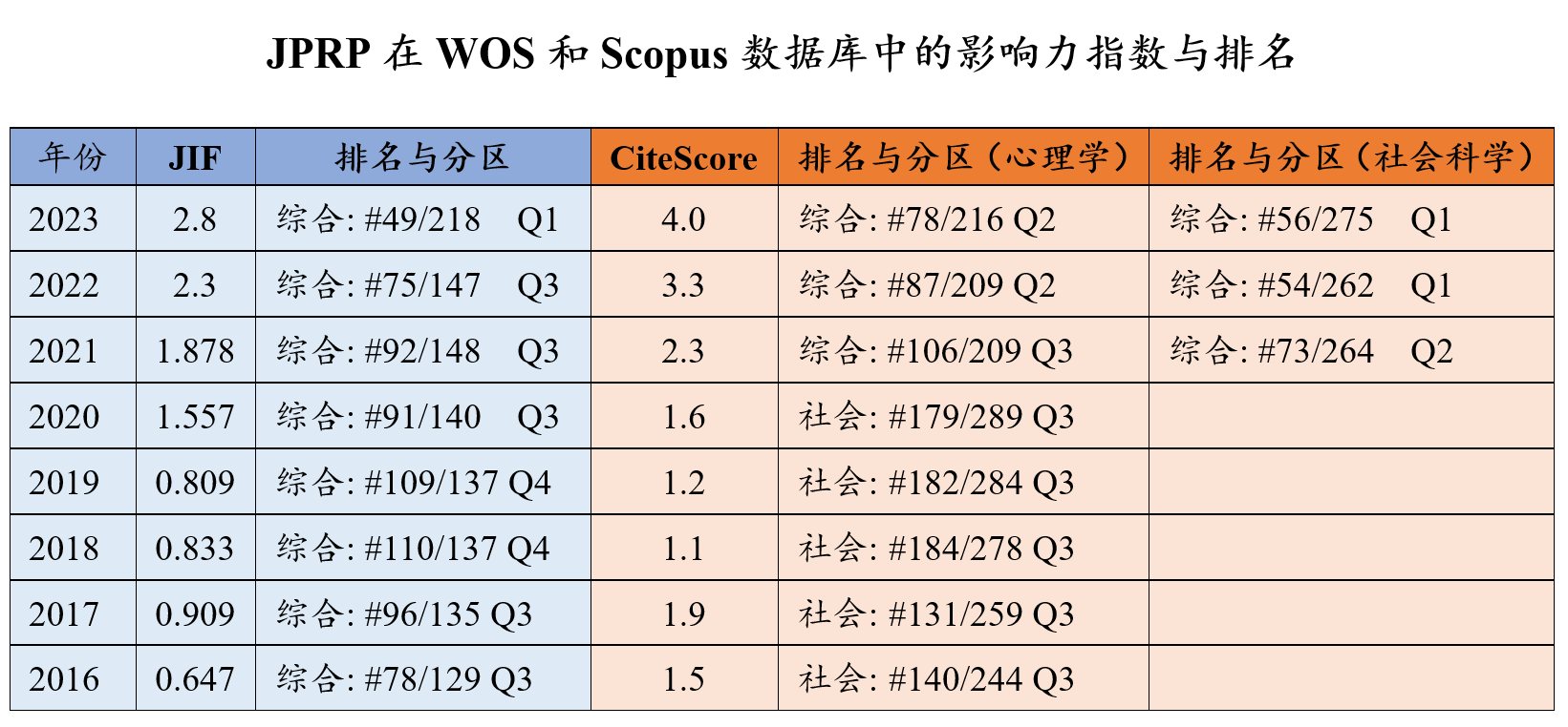 JPRP采用开放获取(Open Access)这一国际最新出版模式出版发行,致力于为环太平洋地区乃至全球心理学界提供一个及时传播最新研究成果的学术平台。作为一本综合性心理学学术期刊,JPRP收稿范围涵盖心理学各领域,向全球读者展示心理学理论、方法以及实践探索的创新。JPRP逐渐成为具有国际和国内学术影响力和知名度的优秀期刊,已进入心理学和社会科学综合领域的第一方阵。