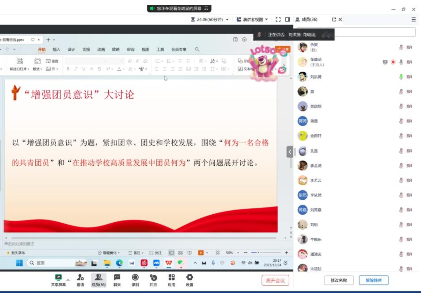 2023年12月24日晚8:00,2023级咨询二班团支部联合2023级MHR团支部在腾讯会议共同开展了专题组织生活会,会议由两个班的团支书花璐涵和余樊共同主持,共分为唱团歌、“增强团员意识”大讨论、“挺膺担当,做优秀团员”组织生活会讨论以及重温入团誓词四个部分,35名团员青年在线上积极参加了本次活动。