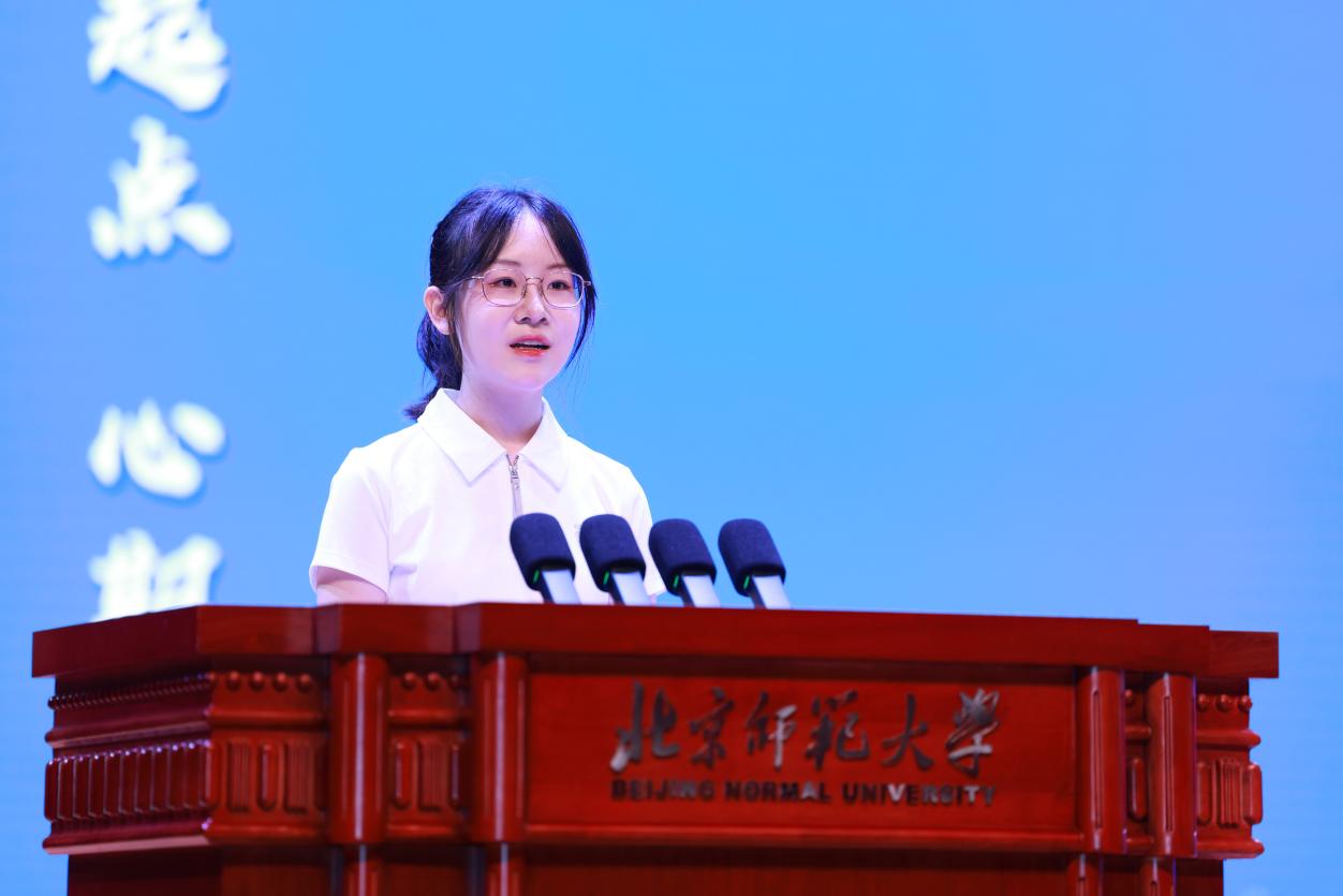 2025级学术硕士张雅淇作为学术研究生新生代表发言。张同学回顾了自己选择教育与学校心理学的初心,分享了自己对于“真正有价值的研究”的理解和思考,鼓励同学们要始终保持对现实世界的好奇与关怀,耐住寂寞、拥有“坐冷板凳”的定力,秉承“服务国家、造福社会”的使命,时刻关注时代需求,将论文写在祖国大地上。