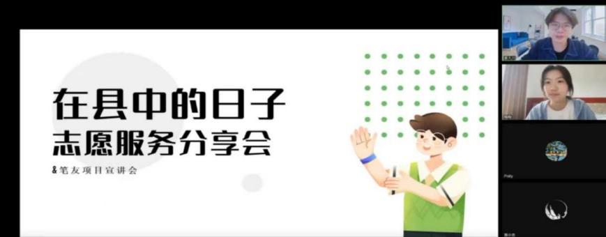 2022年10月9日下午15:00-16:40,由金牌影院 团委志愿服务部主办的心舟笔友项目宣讲会通过腾讯会议在线上成功举办,共有130名同学参与了本次的培训会。 本次宣讲会共分为三个部分——嘉宾介绍、服务营点介绍、分享与对话。 首先,主持人索大川对两位嘉宾PEER毅恒挚友和本次宣讲会的主题——在县中的日子:志愿服务分享会进行了介绍。