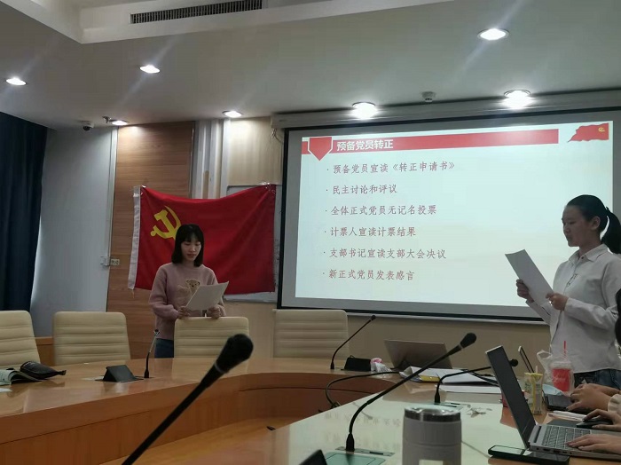 首先,全体参会人员面向党旗起立,齐唱《国际歌》。随后,支部书记廖晨曦介绍转正流程。