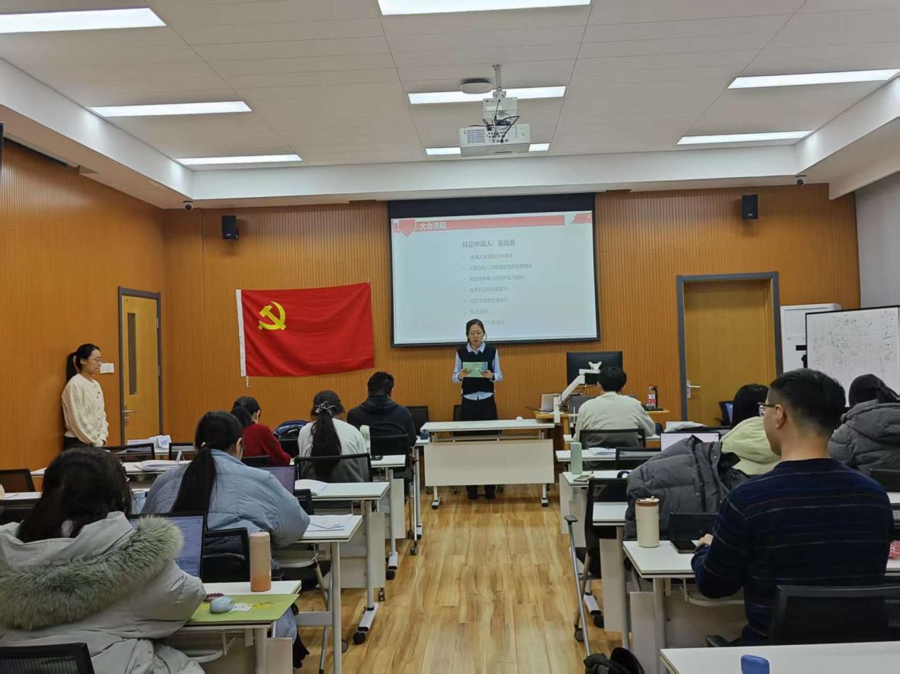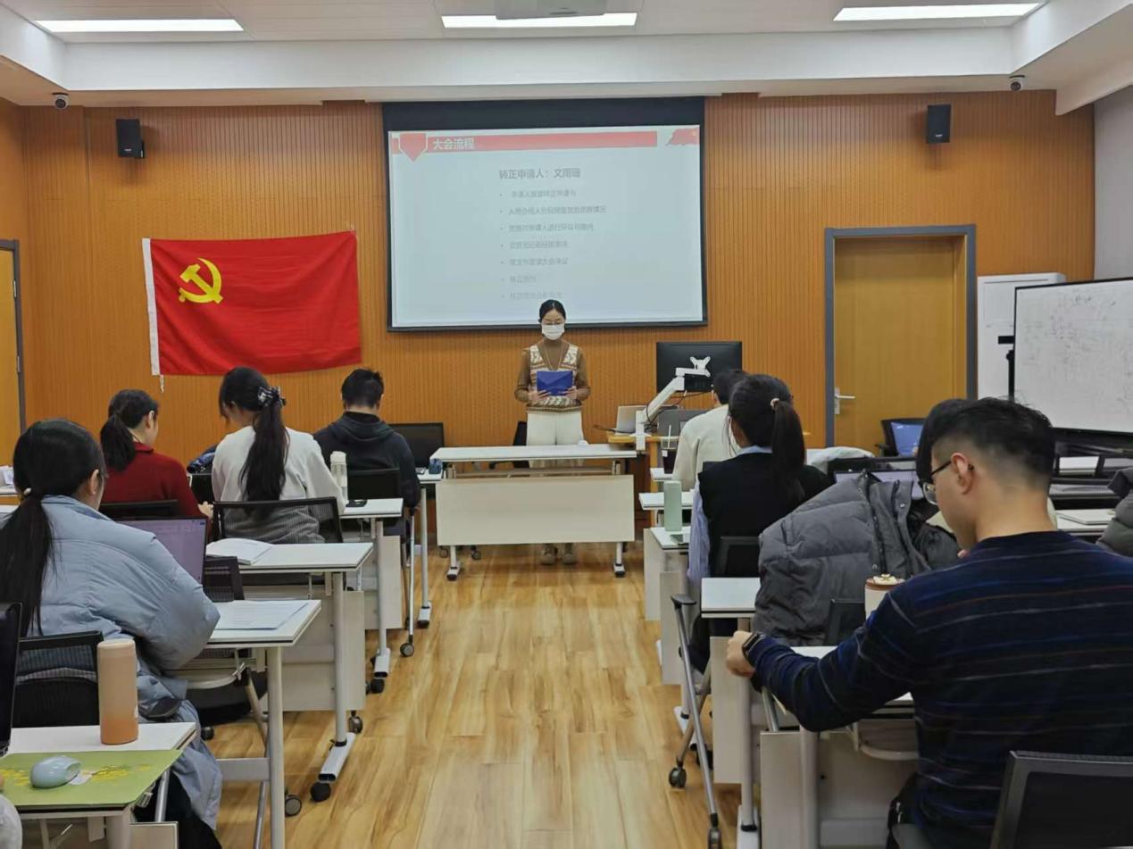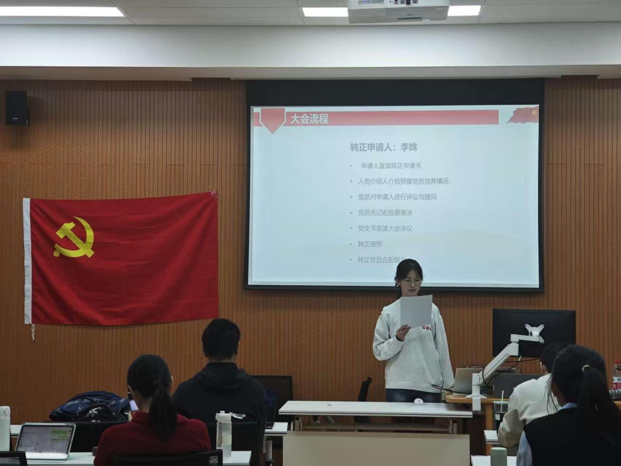 首先,李姝同志宣读转正申请书,向党组织汇报了自己预备期内在思想、理论学习、志愿服务实践等方面情况,重点介绍了自身所在科研领域与理论学习、社会实践等方面的关联,表明成为正式党员的决心和未来努力的方向。接着,支部党员对李姝同志的情况进行了热烈讨论,一致认为李姝同志具备了一名共产党员的条件。与会的全体正式党员进行无记名投票表决,计票人和监票人统计表决结果。随后,孔小杉宣读支部大会决议,同意李姝同志按期转为正式党员。李姝同志发表了转正感言,表示未来将在理论学习、工作等方面更加严格要求自己,不断提升各方面的综合素质。