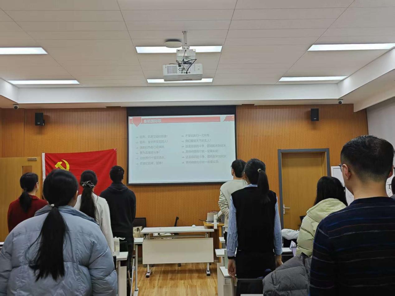会议开始,党支部全体成员起立,合唱《国际歌》。 会议第一项,逐一讨论李姝同志、文雨珊同志、吴怡萱同志预备党员转正事宜。孔小杉对此次转正大会的流程以及三位转正对象进行介绍。