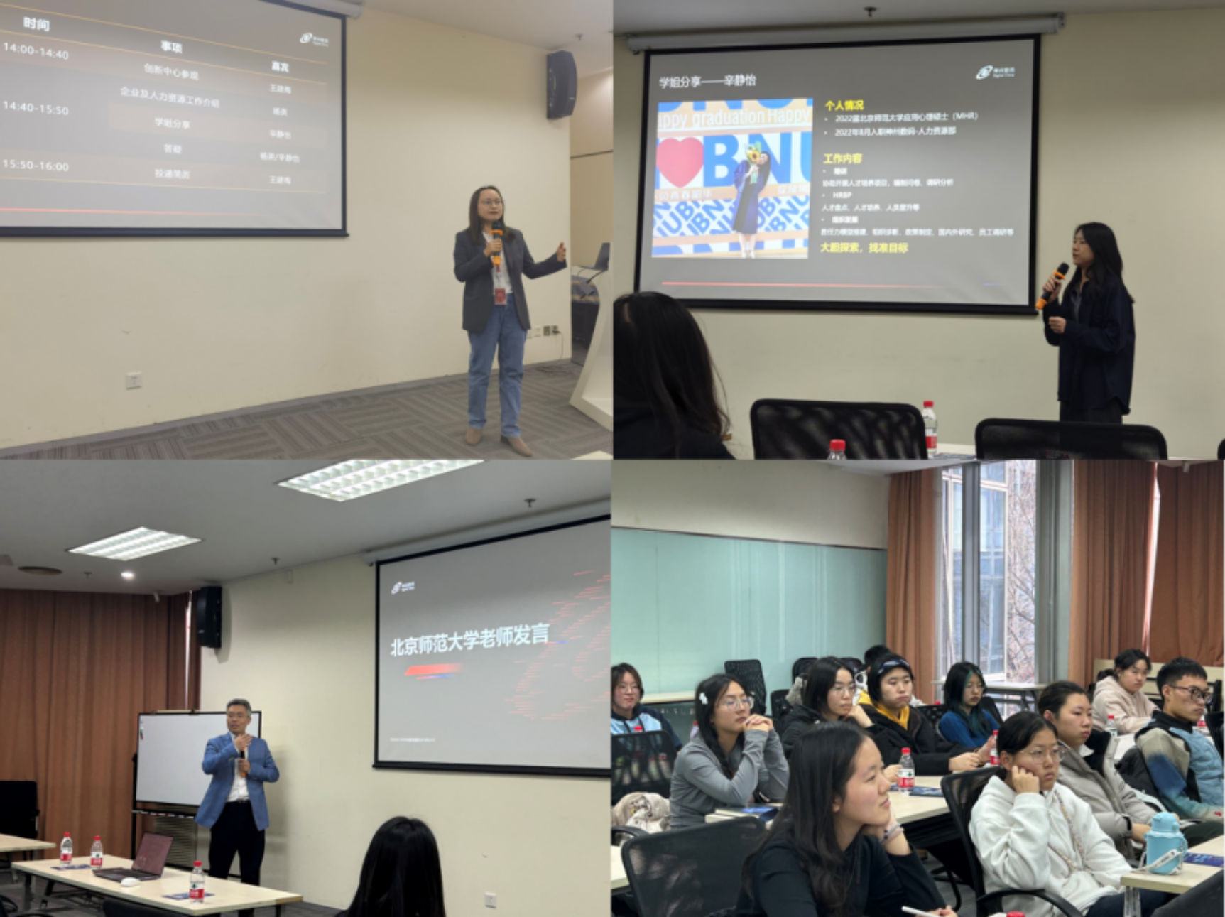 展厅参观结束后,同学们一起来到会议室,聆听神州数码为本次参访设计的专题讲座。首先,神州数码人力资源经理杨英女士分享了公司内部人力资源的相关工作内容,包括招聘、培训、绩效管理等环节,以及各岗位的职责和职业发展路径,使同学们对人力资源领域有了更清晰的认识。随后,校友代表辛静怡分享了自己在神州数码的工作体验,通过实际案例展示了心理学知识与实际工作的融合对个人和企业发展的积极影响,为同学们提供了宝贵的经验借鉴。最后,王小华老师也分享了自己的感受,强调了实践学习对同学们成长的重要性,并鼓励大家积极思考未来职业方向。在互动环节,同学们踊跃提问,就职业规划、专业技能需求等问题与企业代表进行深入交流,现场气氛热烈。