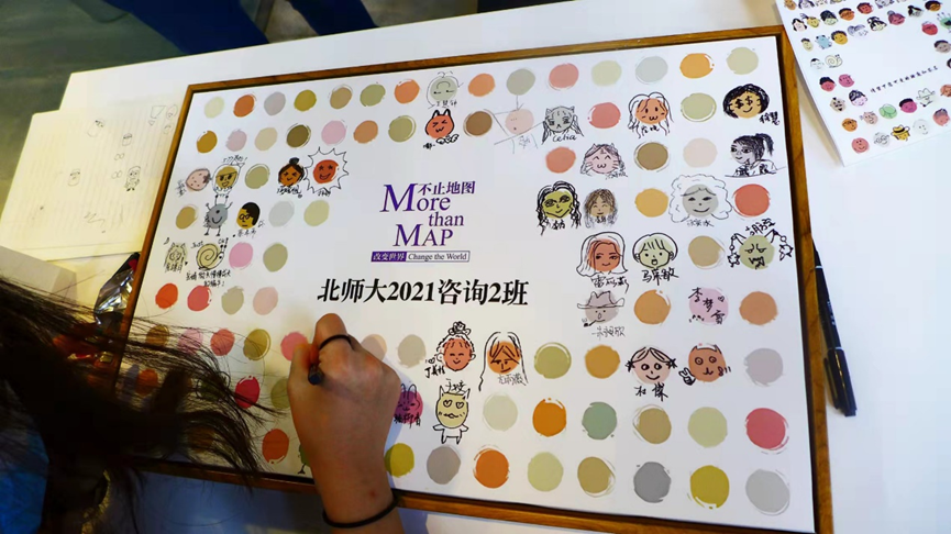 图1 金牌影院 MAP21级北京咨询2班新生见面会同学们精心设计签名板 在活动的最开始,班上的同学们在签名班上绘制专属于自己的一个小头像,最后形成一个代表班级的专属签名板。接着主持人带领同学们做了暖场游戏“叫名字”,班委提前收集好了班上每一位同学的一页生活化的自我介绍ppt,形成了一份特别的“同学录”,每一位同学都需要快速答出一位班级同学的名字且不能重复,紧张快速的氛围一下子就让同学们在游戏中记住了班上不少同学的名字,气氛也渐渐活跃起来。