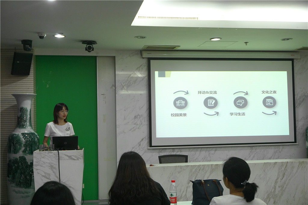 交流视频放映结束之后,经验交流会正式开始。首先,带队老师崔艳丽介绍了本次密大之行的基本情况,她从成员组成、项目申报、行前准备、小组分工、行程展示以及带队老师所承担的角色六个方面介绍了交流团的总体情况,并为即将前往卡迪夫大学的老师和同学们提供了一些小tips作为经验分享。