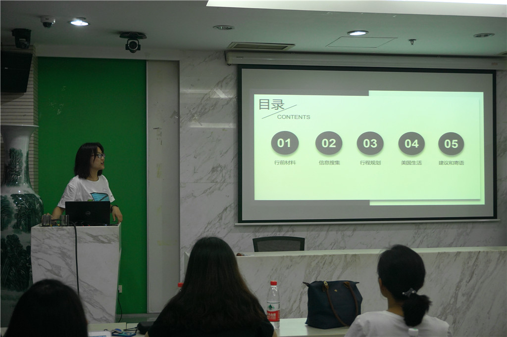 王若茜从行前准备、具体行程、村内日常以及生活贴士几个方面介绍了团长工作,并指出团长工作最重要的是将老师与同学衔接起来,这就需要掌握每个同学的基本信息;对于科研组的工作,她则依据时间顺序介绍了整体流程安排。生活组组长范卓仪抓住信息搜集、行程规划、美国生活三个重点,提出“早、多、诚”三字寄语。宣传组组长罗方丹用多张照片向我们展示密大交流的整个过程,从图片、文字、视频三方面对宣传组工作进行介绍,并提醒大家联系当地学校学生组织进行宣传的重要性。调研组组长肖子璇介绍了调研组同学收集密大实验室与课程信息的过程,并告诫大家一定要提前收集信息及准备各种材料。文化交流组组长陈俊宜则向我们介绍了丰富多彩的文化交流活动的筹备过程以及成员分配到的任务。