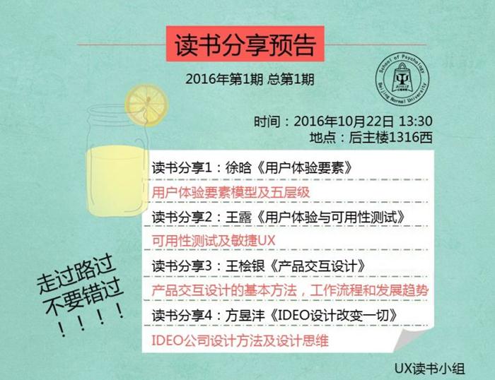 10月22日下午,心理学院MAP用户体验方向的同学们聚集在后主楼1316,开展了UX方向的首次读书交流会。这是同学们自发组织的学习活动,旨在课余时间能更好的交流思想、分享经验、共同提高,并与此同时阅读到更多有益专业学习的相关书籍。 本次读书会有四位主讲人参与其中,每位主讲人都用1课时的时间讲述一本书中的内容和他们读后的心得体会。在读书交流会的过程中,四位主讲人分别分享了《用户体验要素》《用户体验与可用性测试》《产品交互设计》《IDEO设计改变一起》的内容精华,以及他们读后的心得体会与深入思考,整个交流会过程中干货满满。 值得一提的是,读书会摒弃了传统而单一的讲述模式,将其改为可自由提问的形式。即在主讲人的讲述过程中,其他人会随时进行提问和质询。这种形式加深了同学们对整个问题的思考和认识,不再让知识只流于表面,而是经过思考和咀嚼之后用这种形式迸发出新的思维的火花,大大提高了读书交流会的效果。 图一 王桧银同学在分享自己的读书经验 图二 部分书籍图片组成的PPT内容 图三 同学们就问题进行讨论 图四:北师大心理学院MAP-UX读书分享会第一期