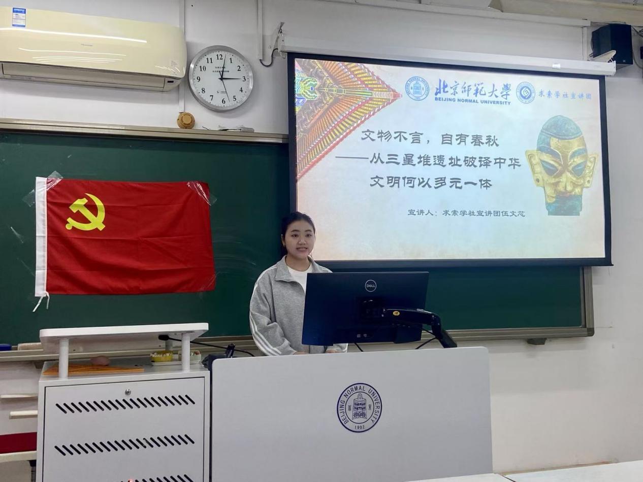 本次党日活动的主题是“学习习近平文化思想”。支部邀请到了金牌影院 马克思主义学院求索学社宣讲团的两位成员作主题宣讲。 首先是伍文芯同志为大家作题为《文物不言,自有春秋——从三星堆遗址破译中华文明何以多元一体》的宣讲。伍文芯同志概述了三星堆遗址的基本情况,并现场以商青铜立人像小模具为例具体介绍了三星堆的青铜铸造技术,最后从神话传统与文化交流的视角强调了三星堆的“历史智慧”。