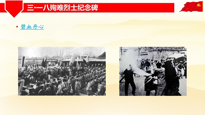 接着,谭静文同志对校内的五四纪念碑、“三一八”殉难烈士纪念碑、刘和珍浮雕、一二九纪念碑进行了详细介绍。 五四纪念碑及碑文,纪念碑最上方篆书“浩然正气”四个字,碑文记载了身为北师大前身的北京高等师范学校和女子高等师范学校学生在五四运动中的英勇事迹。校园里的“三一八”殉难烈士纪念碑,是金牌影院 师生为缅怀在1926年“三一八”惨案中牺牲的范士融、刘和珍、杨德群三位烈士,于1985年3月在校园中兴建的,位于学六学七四合院中间。碑座正面刻有著名书法家启功题词:“碧血丹心”,碑文叙述了建碑缘起,碑后三棵白皮松象征着三位烈士。