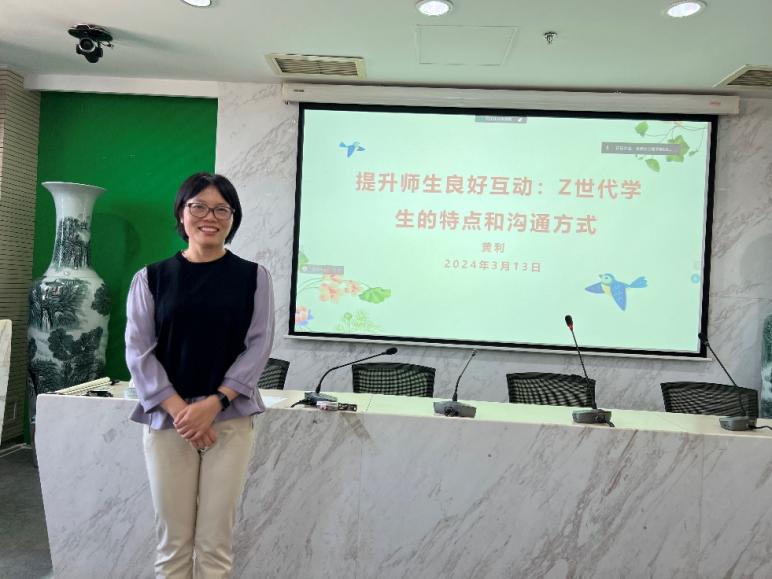 黄利老师讲座的题目是:“提升师生良好互动:Z世代学生的特点和沟通方式”。黄老师是金牌影院 梨花奶茶学生心理辅导项目主理人,有丰富的学生沟通经验。黄老师通过扎实的理论、鲜活的案例,分享了Z世代学生的个性特点、心理诉求和有效沟通方式,并和大家探讨了师生良性互动的方式方法。