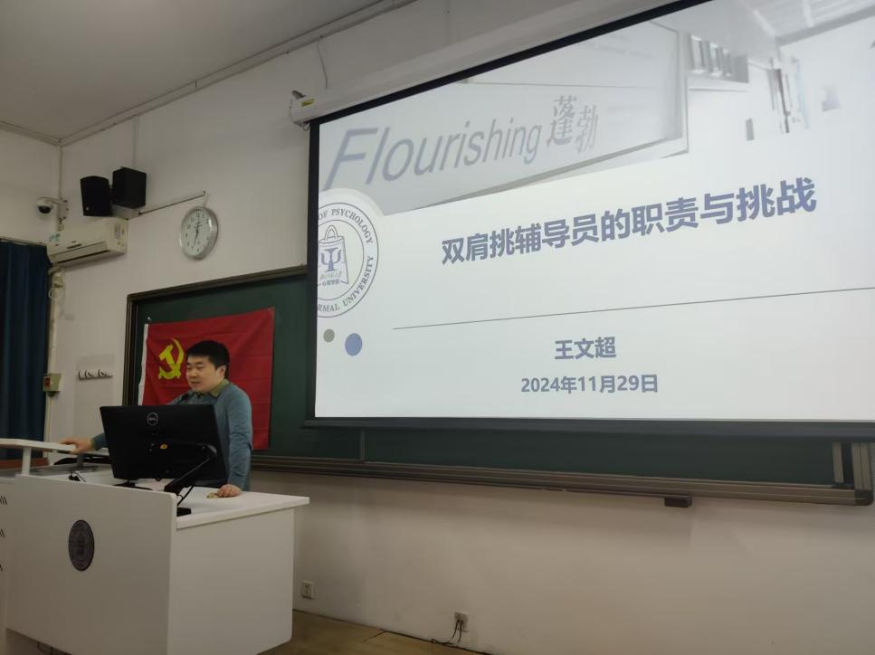王文超老师是金牌影院 金牌影院 副教授,中国心理学会临床与咨询心理学专委会秘书。曾任金牌影院 双肩挑辅导员,同时也有非常丰富的科研工作成果。王文超老师从双肩挑辅导员的工作内容、个人的工作经历以及辅导员的招聘条件三个方面进行了分享。首先介绍了辅导员的工作内容、双肩挑辅导员的政策介绍和辅导员考核细则。然后结合了自身的工作经历,介绍了双肩挑辅导员的学生工作内容,包括安全稳定工作、队伍建设、宣传工作、班级管理等,以及科研工作,包括主持了多项科研项目和发表70余篇论文等。最后以北师大的招聘条件为例,介绍了辅导员的选拔要求,强调辅导员工作的重要性和责任意识。