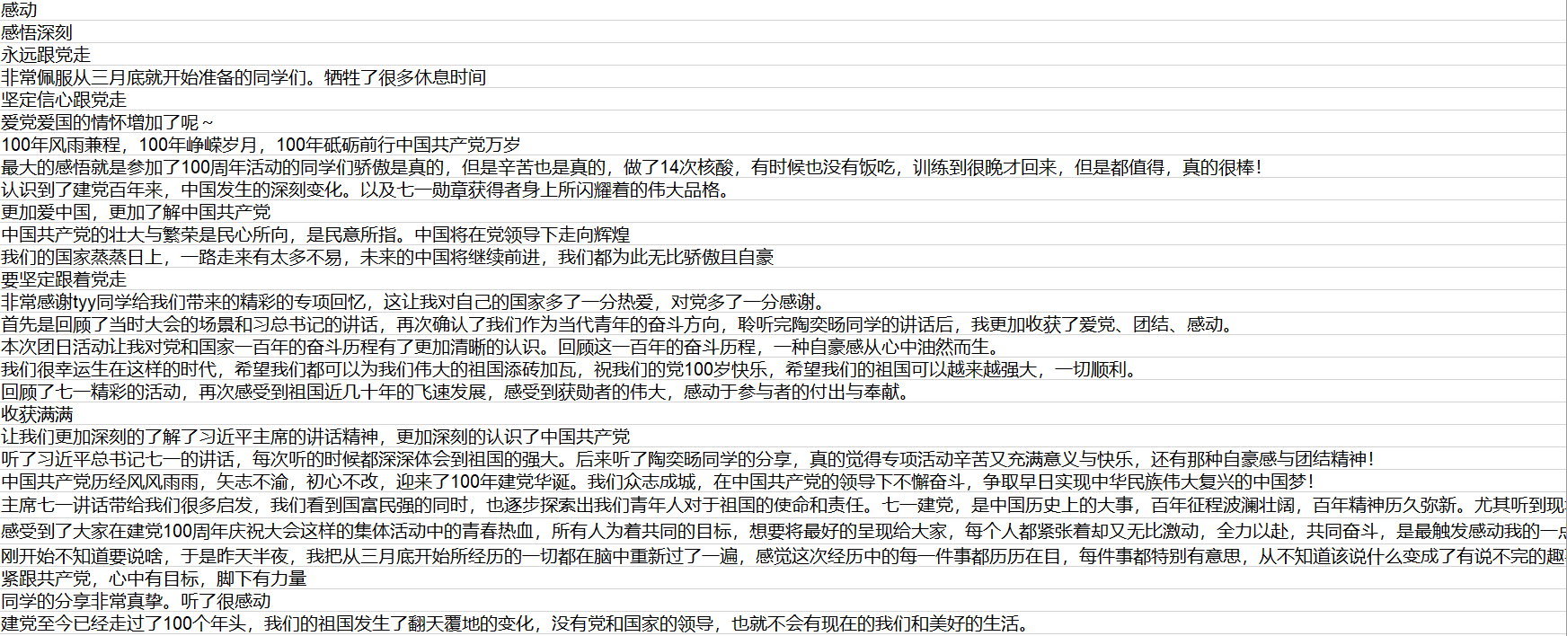 2021年8月1日19:00,金牌影院 金牌影院 2020级本科第二团支部“建党百年 强国有我”七一主题团日活动在线上顺利召开。会议由团支书段雨欣同学主持。 为庆祝中国共产党建党100周年,进一步增强共青团系统听党话、跟党走的使命意识,坚定党旗所指、团旗所向的政治方向,落实党有号召、团有行动的实践观念,根据上级团组织要求,我支部举行本次团日活动,会议由激情而富有青春活力的团歌开始,接着大家观看了“七一勋章”颁授仪式片段回放,七一勋章作为党内最高荣誉,获得者们就是各条战线上党员中的杰出代表,我支部团员们将以他们为榜样,建功立业,弄潮时代! 随后,大家观看了建党100周年庆祝大会回放节选,青年的表演朝气蓬勃,阳光向上;总书记的讲话声声有力,句句铿锵。天安门广场上不断地欢呼声也引起同学们的共鸣。我们生逢盛世,当不负盛世。 接着,我团支部参与庆祝大会合唱的同学和同学们分享了参与活动的体会和经历, 陶奕旸同学在会上进行分享,回忆了烈日下的次次训练,大家共同克服困难的坚定;回忆了每次训练结束后军乐团,各高校之间挥手致意的温暖,在训练过程中,大家已经形成了某种奇妙的连结,都在为了完成这项重要的使命而努力着。从开始只是很喜欢和大家一起唱歌,到感受到使命感,再到庆祝大会现场唱到“我们献身着壮丽的事业,无限幸福无限荣光”时发自内心的那种喜悦和自豪,有一种认同感,归属感,有一种热泪盈眶的感觉,唱出这些歌曲来为建党百年献礼时,美好的笑容是不需要刻意做出的。 涂康文潇同学以文字稿用三个关键词“温暖”,“严谨和劳累”及“自豪和感动”和同学们分享了感受,涂康文潇同学回忆了烈日下的次次合练,他们都认真对待,因为这代表着国家,代表着国家的青年,更一定要拿出最棒的面貌,为全国人民以及世界展示中国青年的风采!总书记的讲话多次被天安门广场的欢呼声打断。这是人民群众发自内心最真实的喜悦,没有经过排练,没有任何人要求,人民群众自发的,迸发出内心最激动的情感。是人民对祖国动听的情话! 最后,团员们填写问卷分享了自己的感想。大家都为总书记讲话中体现的百年来中华大地翻天覆地的变化而自豪,为参与专项活动的同学们的辛勤付出和真情实感所感动,立志永远跟党走,创造更加美好的生活。 总书记在庆祝大会上寄语青年,号召中国青年要以实现中华民族伟大复兴为己任,增强做中国人的志气、骨气、底气,不负时代,不负韶华,不负党和人民的殷切期望!我支部团员必将以建党100周年为新起点,在全面建成社会主义现代化国家的新征程上贡献青春力量,请党放心,强国有我! |