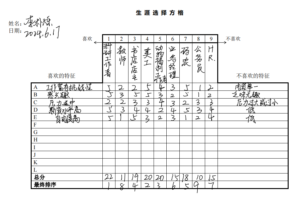 近日,在我班举办的团日活动中,同学们通过通过角色建构库测验(REP Test)这一创新方式,对自己的职业兴趣和就业倾向进行了深入的探索和了解。角色建构库测验是心理学家凯利发明的一种心理测量工具,通过分析个人对不同角色的看法和偏好,揭示其内在的职业兴趣和倾向。 活动伊始,团支书向同学们介绍了REP Test的基本原理和操作流程,强调了正确就业观的重要性——即选择职业应基于个人兴趣、能力和社会需求的结合,而非单一追求物质待遇或社会地位。随后,同学们被引导列出一系列与自己感兴趣的职业相关的角色,并对其进行描述和比较。 在填写方格的过程中,同学们对"喜欢的特征"和"不喜欢的特征"进行了评分,涉及人际交往、创意表达、持续学习等多个维度。 让我们来看看同学们的生涯选择方格填写情况吧: